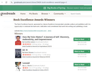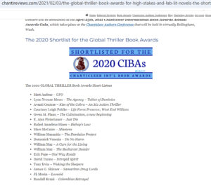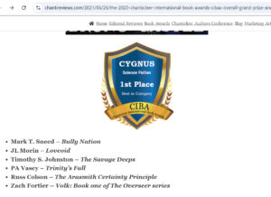 Cygnus 1st Place Sci-fi Award Winner; eLit Silver Medalist 2022; Book Excellence Award Finalist; ScreenCraft Semifinalist (top 12% of submissions); Fish shortlist (top 4% of submissions); Global Thriller Book Awards for High Stakes and Lab Lit Novels shortlist