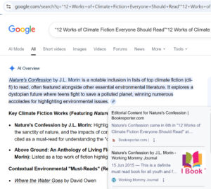 Her cli-fi novels are on course syllabi at many universities. Ivy League professors have facilitated discussions with JL Morin’s writing, and it is discussed in textbooks, such as Science Fiction and Climate Change: A Sociological Approach, by Andrew Milner, and J. R. Burgmann, 2020, published by Oxford University Press.
