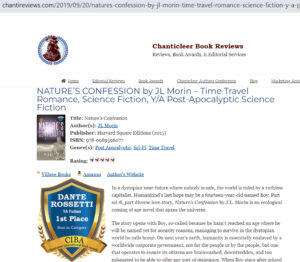 “Nature’s Confession—that she might not be able to sustain the human race anymore—will appeal to readers who like their sci-fi broad and far-reaching. This novel continually moves from one plot point to the next, often switching characters to give a broader sense of the story, and never lingers too long on the technicalities. Alien lifeforms, alternative clean energy sources, intergalactic travel as well as time travel, multiple realities abound in this diverse, multi-cultural love story. Morin does an excellent job using Nature’s Confession as a timely foil for the challenges our society faces regarding climate change, big industry, sustainability and how the human race will survive. Highly recommended. Nature’s Confession won 1st Place in the CIBA 2017 Dante Rossetti Awards for Young Adult Fiction.”