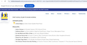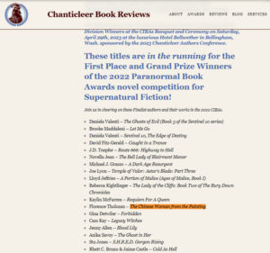 Nautilus Book Award Silver Medalist, Small Press Fiction; Next Generation Indie Book Award Finalist, 2022, FIRST NOVEL (70,000 TO 90,000 WORDS); Semi-finalist in the Chanticleer Paranormal Book Awards Novel Competition for Supernatural Fiction, 2022; St Clément Authors’ Words Prize Winner, 2020; Romantic Book Prize finalist, 2019; Lions Literature Award, 2021 finalist; Asia 2021 Award finalist; Prix des Auteurs Inconnus Shortlisted, 2020